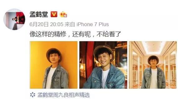 近日,德云社相声演员孟鹤堂通过个人微博发布了3张自己的精修照片,并说“像这样的精修,还有呢,不给看了”。