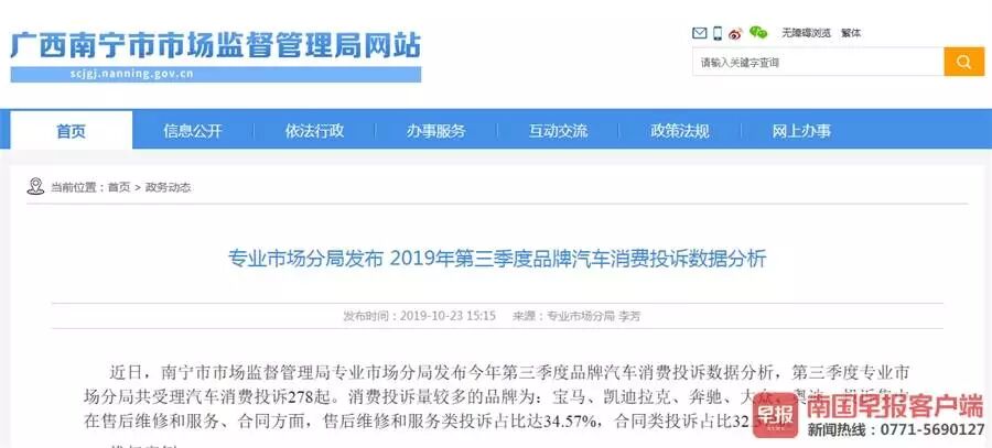 据了解,今年第三季度,南宁市市场监督管理局专业市场分局共受理汽车消费投诉278起。消费投诉量较多的品牌为宝马(22件)、凯迪拉克(20件)、奔驰(20件)、大众(18件)、奥迪(15件),投诉集中在售后维修和服务、合同、质量等方面。其中,售后维修和服务类投诉占比达34.57%,合同类投诉占比32.37%。