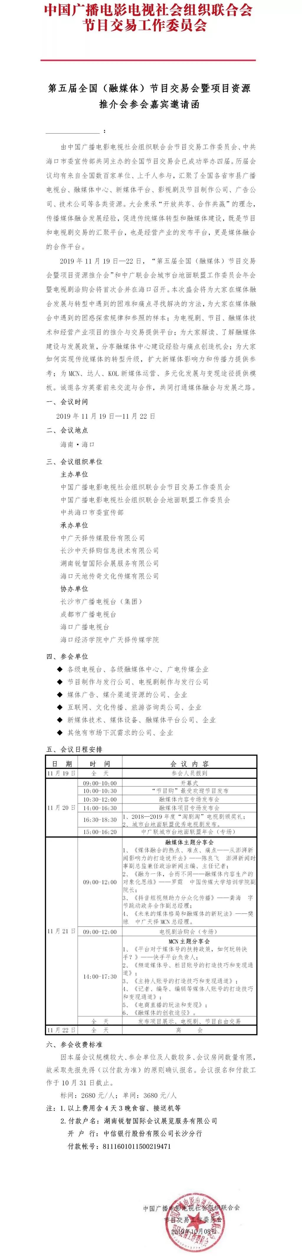 2019年11月19-22日,“第五届全国(融媒体)节目交易会暨项目资源推介会”和中广联合会城市台地面联盟工作委员会年会暨电视剧洽购会将首次合并在海口召开。大会秉承“开放共享、合作共赢”的理念,传播媒体融合发展经验,促进传统媒体转型和融媒体建设,既是节目和电视剧交易的汇聚平台,也是经营产业的发布平台,更是媒体融合的合作平台。