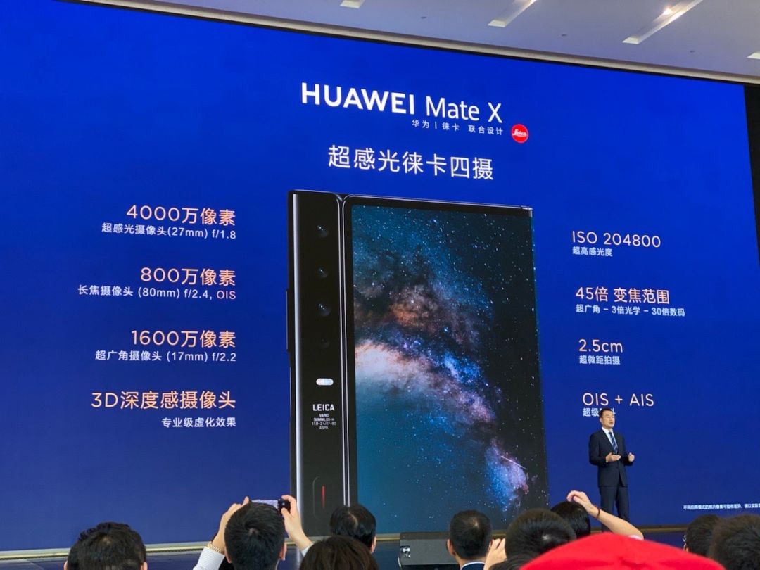 在相机配置方面,搭载4000万像素超感光摄像头(27mm)f/1.8,800万像素长焦镜头(80mm)f/2.4支持OIS光学防抖,1600万像素超广角镜头(17mm)f/2.2,3D深度感摄像头支持专业级虚化效果。Mate X的镜头支持ISO 204800超高感光度,支持45倍变焦范围(超广角-3倍光学-30倍数码),2.5cm超微距拍摄,支持OIS+AIS超级防抖。