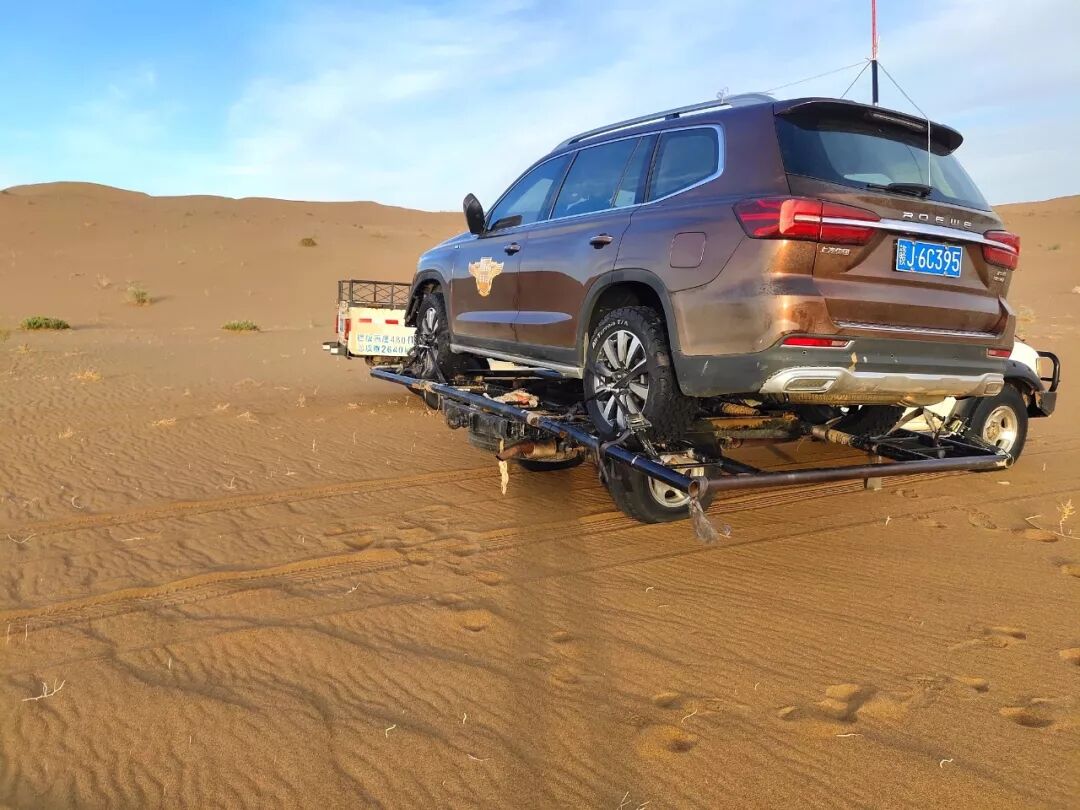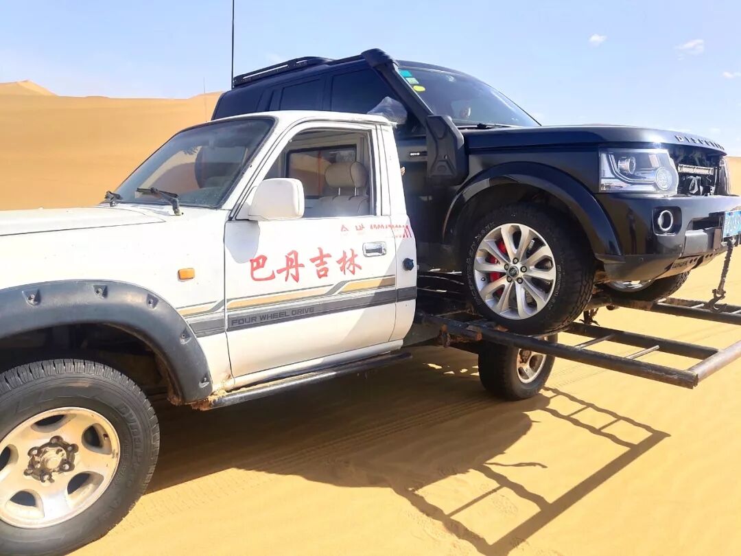 后来只能直接从电脑接电给风扇,走了不久发动机开始漏油,可能长时间高温,加上水箱又缺水,导致发动机冲缸了,车辆无法继续前行了,只能安排拖车。大家看到的拖车照片都是第四天的事情,当时只能记录下坏车位置的座标,等车队到了塔哥家再安排拖车回来救援。