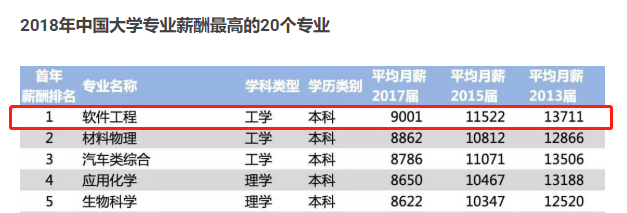 软件工程发展到如今已成为一个特别热门的学科,从上表可以看出,前10%的17所大学均为一流大学建设高校,可见学科的热门程度及高校的重视程度。在就业方面,前景也很广。阳光高考信息平台最新数据显示,近三年软件工程的全国本科生就业率逐年递增,由80%增至95%,属于就业情况很好的专业。在中国薪酬网上,软件工程也排在2018年中国大学毕业生薪酬排行榜榜首。