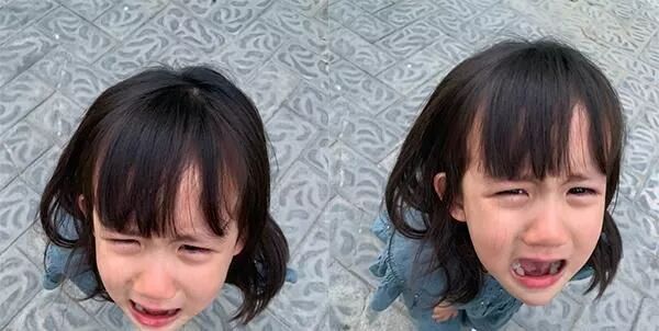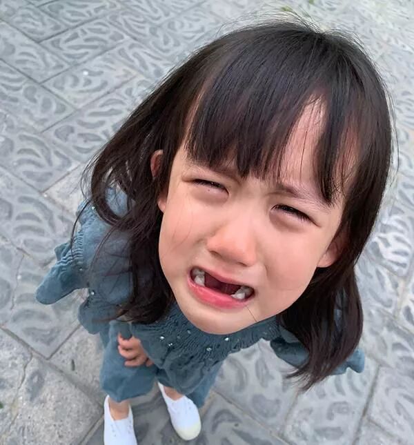 多妹是越哭越凶,眼睛都快眯成了一条线,头发丝都含在嘴里,看起来非常的难过。额前的碎发更是衬托得小脸儿格外可爱,这双饱含热泪的大眼睛看着老爸。多妹张开着嘴,可以清晰地看到下门牙已经都脱落了,到了换牙的年纪,而在哭的时候下门牙脱落的地方则已经被嘴唇“填满”了。