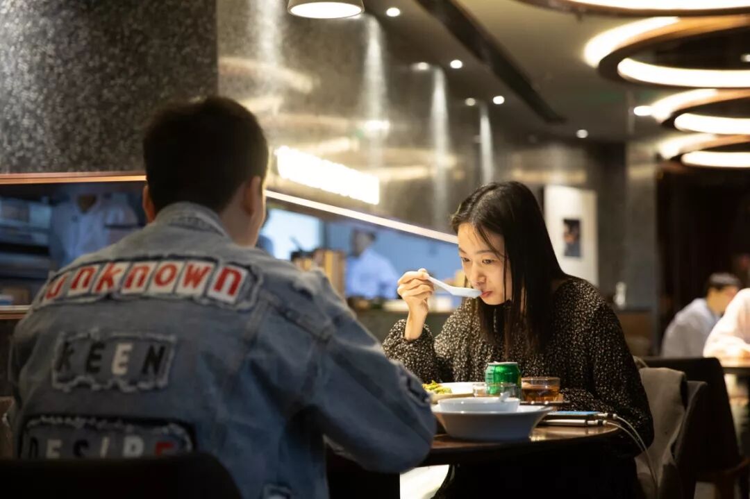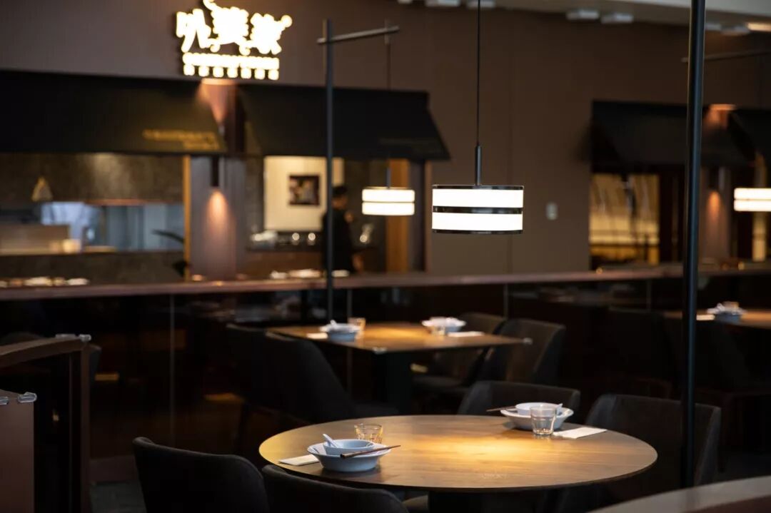 走进餐厅,黑白斑点交错的大理石地面上,各种壁灯和顶灯的柔和灯光肆意洒落,让人恍若走进温柔的星河中。深灰与原木色调相互融合,整个就餐环境优雅而舒适,迎接着每一位来邂逅美食的食客。