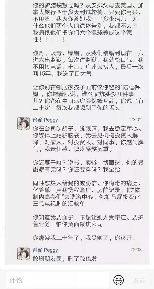 A轮融资、做业务、B轮融资、做业务、C轮融资、上市、抵御电商价格战四个老人送走三个、每个都是频繁进出医院,孩子有多种过敏,医院从护士到主任,都认识这个“懂事”的孩子,摔在铁丝网上,自己让保姆带去儿研所打了破伤风,晚上回家再告诉爸妈。我出国给大夫们当驼夫,主任医师庞奶奶,为了谢我,几次来家里给孩子出诊。孩子肺炎住院两个星期,我、我侄子、秘书、司机、保姆轮流陪床,我白天正常上班,你“李总”知道儿科病房在几层吗?幼儿园、小升初、中考、上大学、你管过什么?我没给你洗过几次袜子,每次搬家,你挪过一张纸吗?我跟公司搬仓一样,写计划、分类、贴标签、按类装箱、有目录, 一天之内全部复原,你到家的时候,茶壶都在熟悉的位置。我没给你洗袜子?我给你、家干的活儿有多少?有些,是做媳妇的义务,有些,真让我害膜。除了委屈自己,我干过的违心事儿不多,答应给你妈写悼词,最窝心你忙着遗体告别仪式,大校、司长、团长来不来,让我写悼词,我写了。之后几年你去扫墓,我只想在景仰园的墓碑上,写个黑色条幅:孩子生了要养育,6个孩子一窝糟,你们干嘛去了?你的驴脑袋想过吗?从安排父母去美国、加拿大旅行四十多天到试轮椅,只要你高兴、不甩脸,我为你爹娘我干了多少活儿,为什么他们两个人的遗体告別,我都不去?我痛恨他们把你们六个混球养成这个德性!!!!你哥,吸-毒、嫖-娼,从我们结婚到现在,六进六出监狱。每次进监狱,我就松口气,我不用接电话、丰台、广州去捞人,最后一次判15年,我送了口大气。让你别在邻居家孩子面前谈你爸的“陪睡保姆”,你撇着眼说,谁么家炕头没几件事儿?你爸在中日病房跟保姆互舔,你说了有二十次,每次我都想剁了你的舌头你在公司吹胡子、瞪眼睛,我去稳定军心。你媒体上踢驴脑袋,我去见机构投资人解释。对家人、对投资人、对同事,你越闹脾气,我责任感、愧疚感越沉重。你还要干嘛?说书、卖惨、博眼球,你的暴露癖有完吗?你还要料吗?我全给同性恋烂人给我的威胁信、你梅毒的病历、化验单,用我携程账户开房的记录、你“体制内高参们”去洗浴中心、你拍马屁投资官三代电视剧的汇款单你知道我要面子、不想让别人受牵连、要护着业务,怕你负面聚焦公司你绑架我二十年了,我受够了,你滚开!