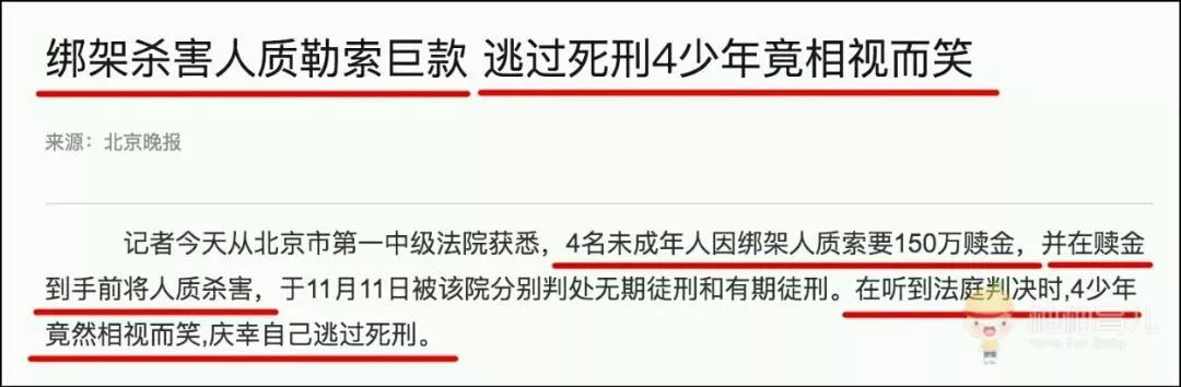 2004年北京的一起未成年人绑架案,4名未成年人绑架人质(他们认识的同学)索要150万元赎金,而在赎金到手前却将人质杀害。