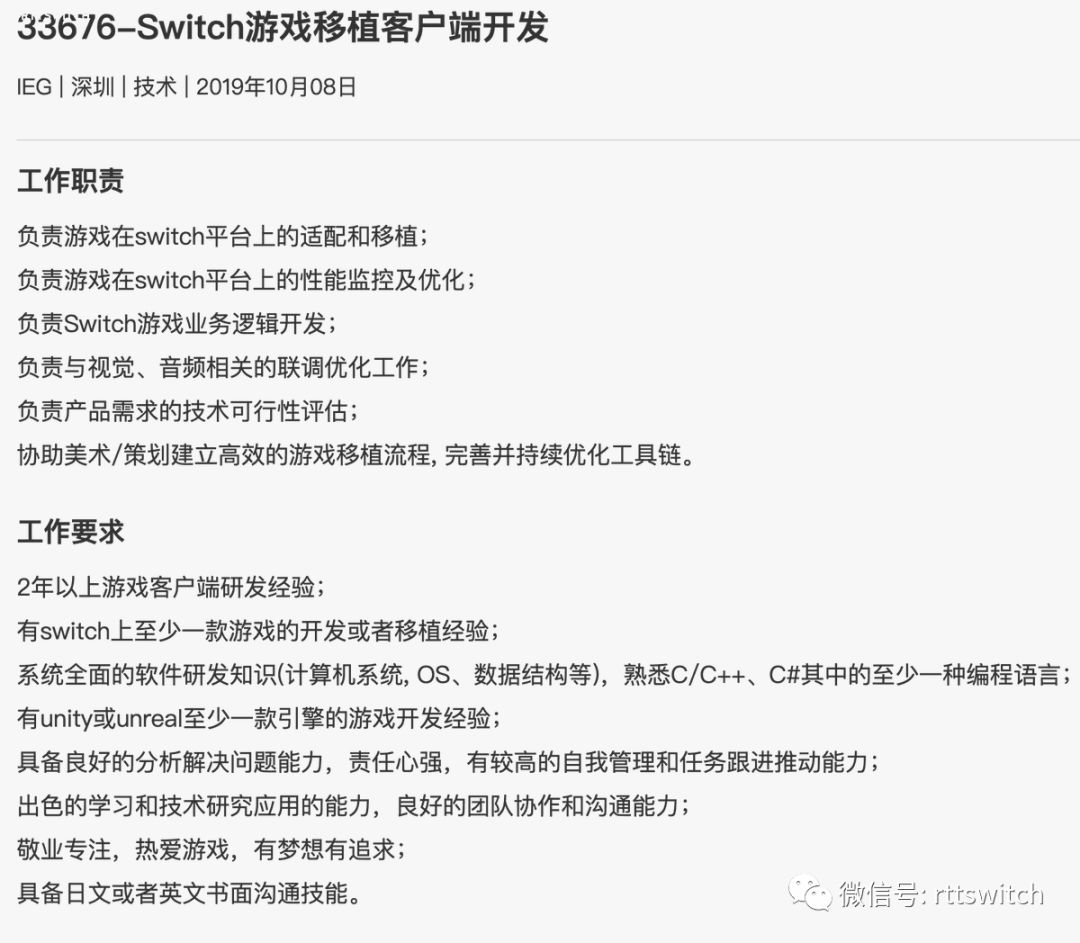 最近根据腾讯招聘网站上有多了几个跟Switch相关的招聘,比较特别的是,本次招聘的并不是为Switch国行项目服务的,而是负责移植游戏到Switch平台的开发人员。