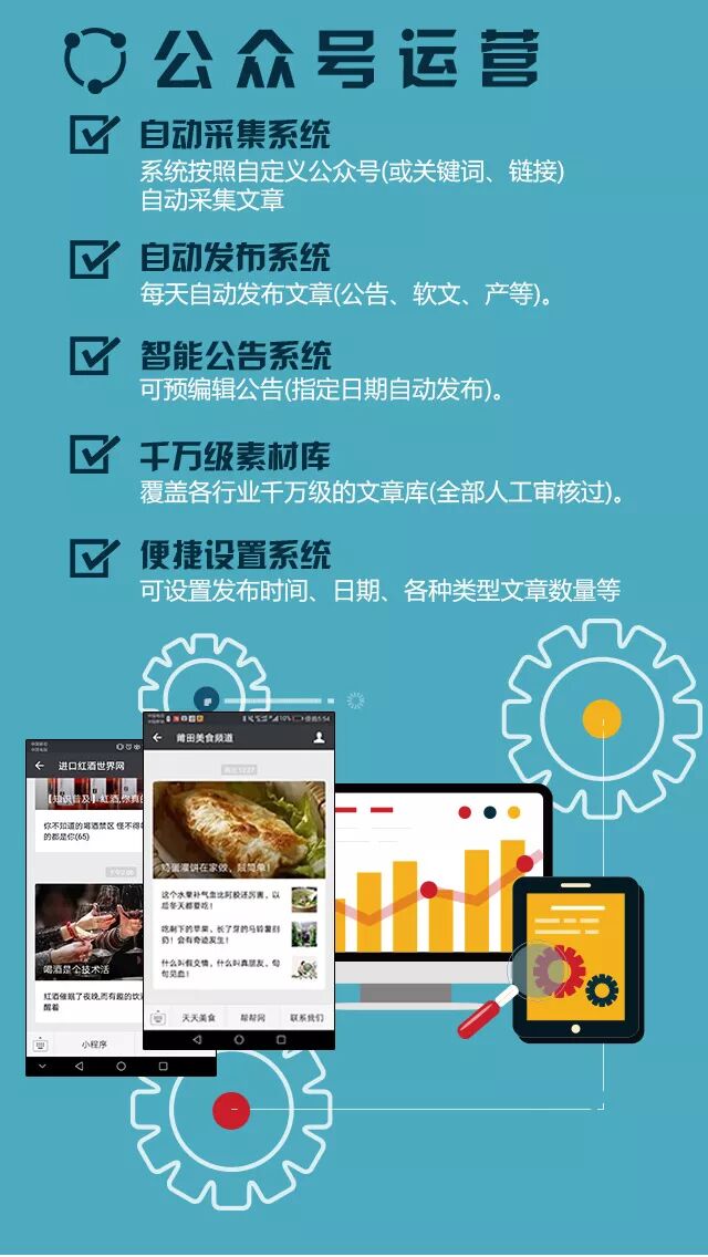南宁公众号运营【万客通科技sell】?流量时代已经过去了,在流量明码标价的时代,对于所有公司来说,谁能吃透“内容为王”的逻辑,快速理解“好内容自带流量”的机会,谁就能用低成本撬动大市场。微信作为国民应用,微信公众号是每个公司都不能舍弃的战场,腾讯数据显示目前已经有两千万多的公众号。公众号同时牵动着产品和市场。正是看到这个潜在商机,企动公司重磅推出了公众号全自动智能运营机器人——订阅宝,每天自动推送最新热点新闻,为企业采集专业的行业资讯,每天定时定点智能推送,两千万公众号运营首选,客户零操作,一站式解决文章编辑、发布、推广等运营难题,低成本全自动智能运营,省时省力更省心,微信公众号运营推广一步到位!?