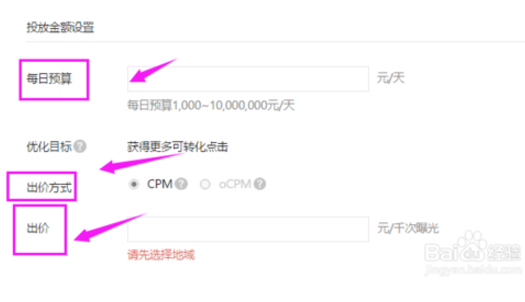 八、接着就涉及到费用的问题了,我们设定每日预算、出价、出价方式的选择,这个小编就要根据行业来定了,还要根据城市来定,一线城市的出价,二线城市的出价都是不一样的,不通的行业,出价也是不一样的,具体情况要具体来看,但是最低每次单价出价不得低于30元/千次,充值不得低于2000元。