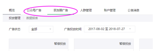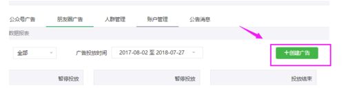 三、小编就选择“朋友圈广告”来介绍下,我们点击右侧的“创建广告”,如图