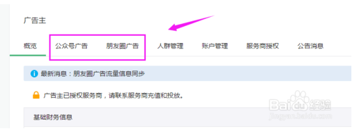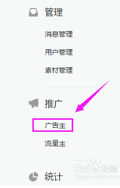 一、来到微信公众平台,我们在左侧的推广中,点击“广告主”,如图。