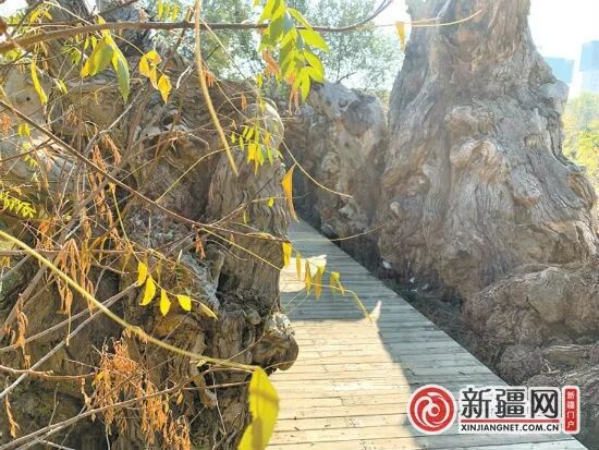 汗血宝马、胡杨枯木、草原石人、硅化木……在满园榆树和文冠树的点缀下,构成了新疆古生态园的秋景。
