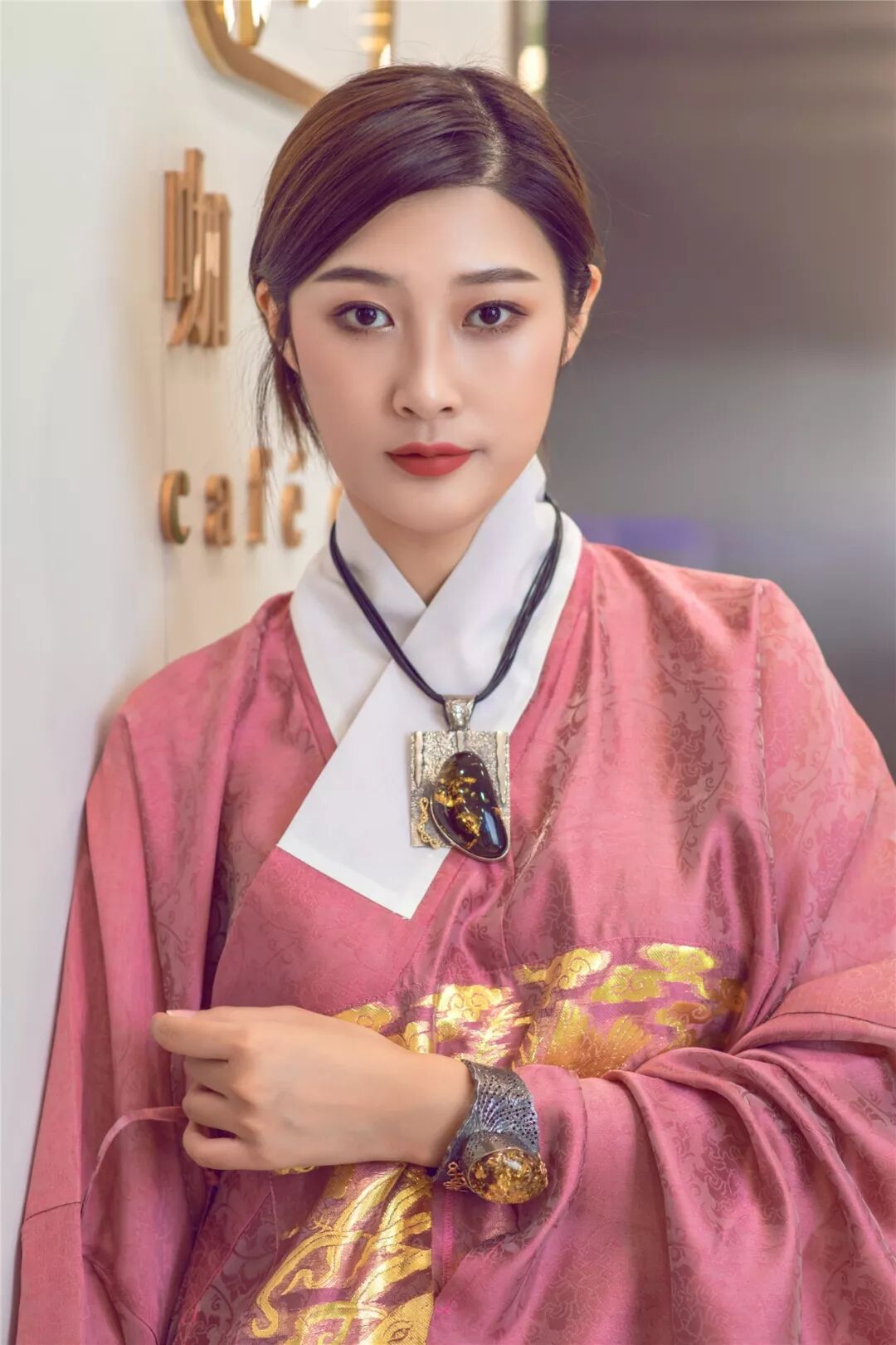 用汉服来搭配琥珀吊坠,琥珀温润的光泽和质感也被衬托的越发出彩,佩戴者的气质立刻突显。