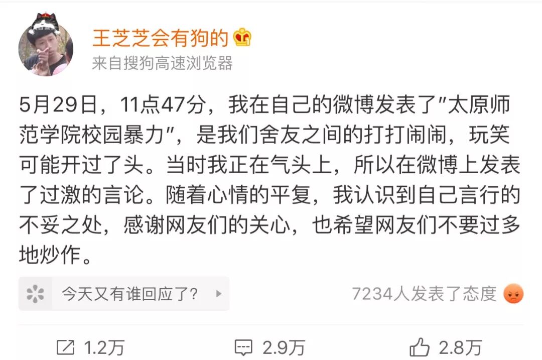 29日21:25,微博账号@王芝芝会有狗的发帖表示,“5月29日,11点47分,我在自己的微博发表了‘太原师范学院校园暴力’,是我们舍友之间的打打闹闹,玩笑可能开过了头。当时我正在气头上,所以在微博上发表了过激的言论。随着心情的平复,我认识到自己言行的不妥之处,感谢网友们的关心,也希望网友们不要过多地炒作。”