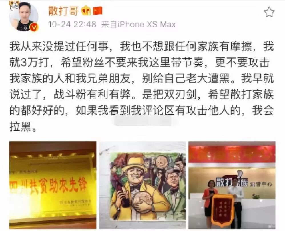 散打哥昨晚发文表态,称我从来没提过任何事,我也不想跟任何家族有摩擦。我就3万打希望粉丝不要来我这里带节奏,更不要攻击我家族的人和我兄弟朋友,别给自己老大遭黑。我早就说过战斗粉有利有弊是把双刃剑,希望散打家族的都好好的!
