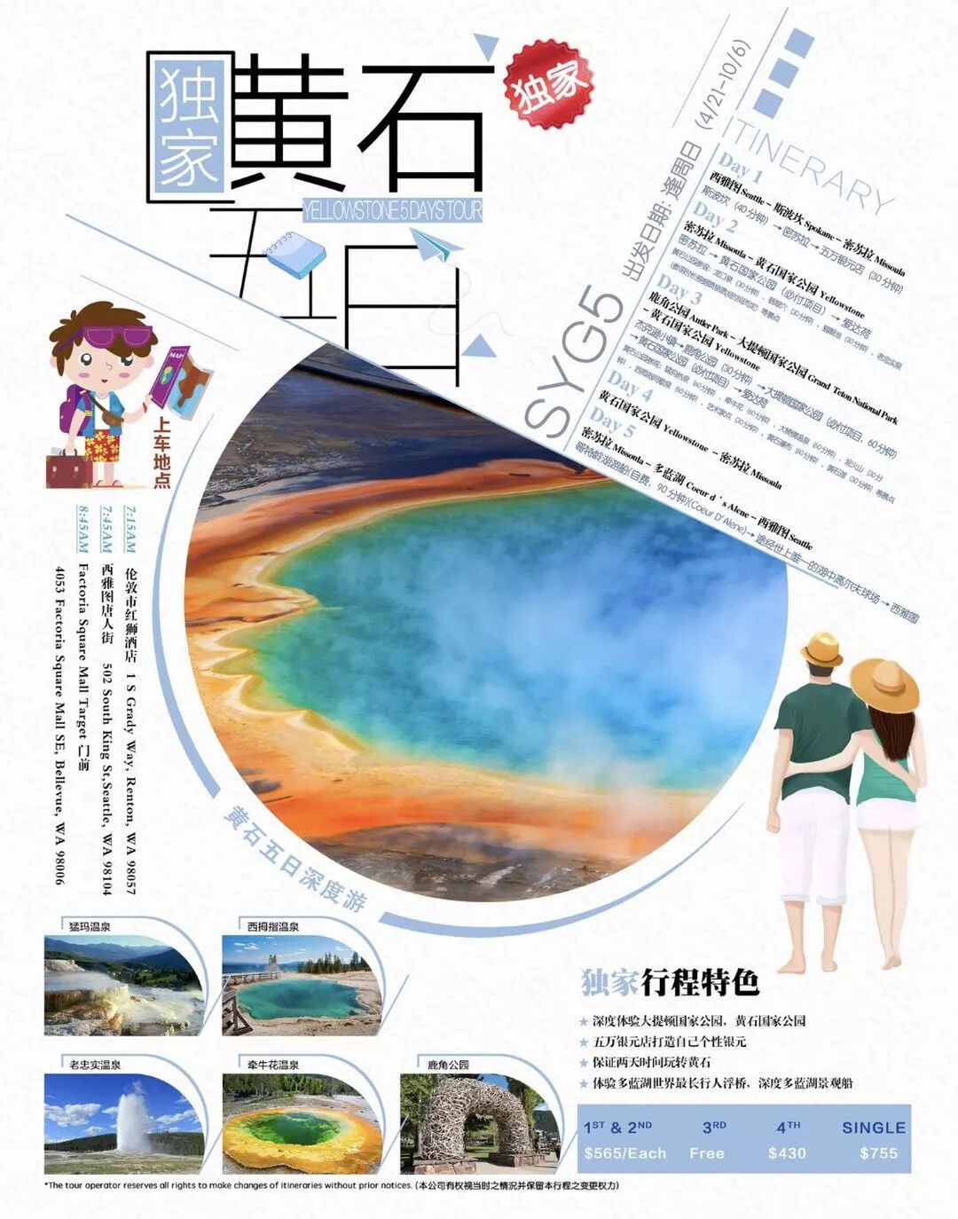 西雅图进出黄石公园4-9日游,买二送一,360元起,西雅图唐人街/伦敦市红狮酒店上车,或西雅图机场免费接机。