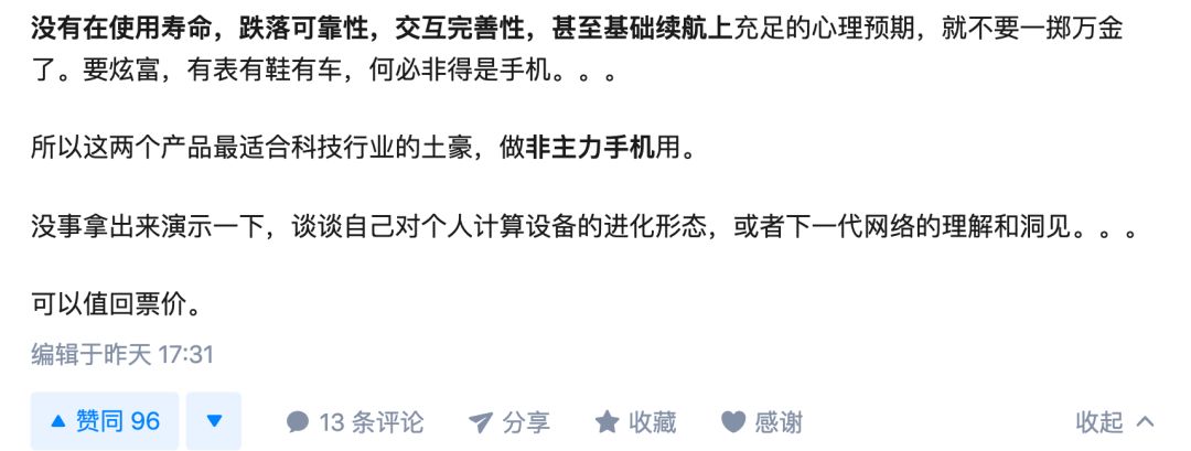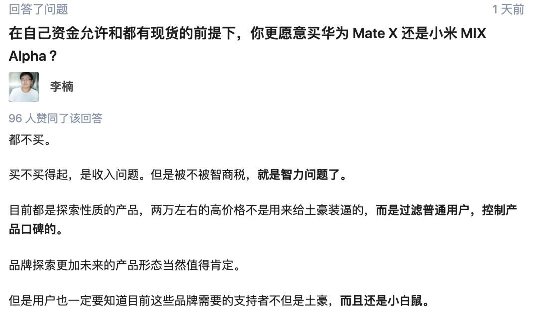 如上图所示,李楠在“在自己资金允许和都有现货的前提下,你更愿意买华为 Mate X 还是小米 MIX Alpha ?”的问题中明确表示,这俩旗舰都是探索性产品,都不买。两万左右的高价格不是用来给土豪装逼的,而是过滤普通用户,控制产品口碑的。