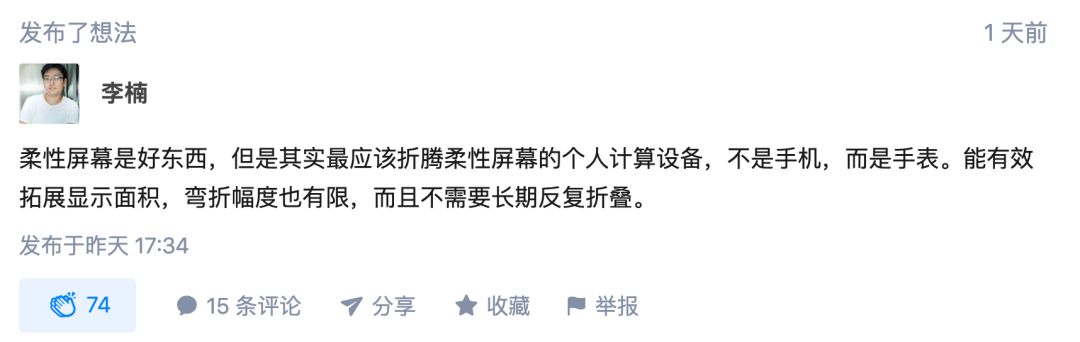 随后,李楠还针对从去年开始流行的柔性屏产品(柔宇、三星Fold、华为Mate X、小米MIX Alpha等等)一概而论「柔性屏幕是好东西,但是其实最应该折腾柔性屏幕的个人计算设备,不是手机,而是手表。能有效拓展显示面积,弯折幅度也有限,而且不需要长期反复折叠。」