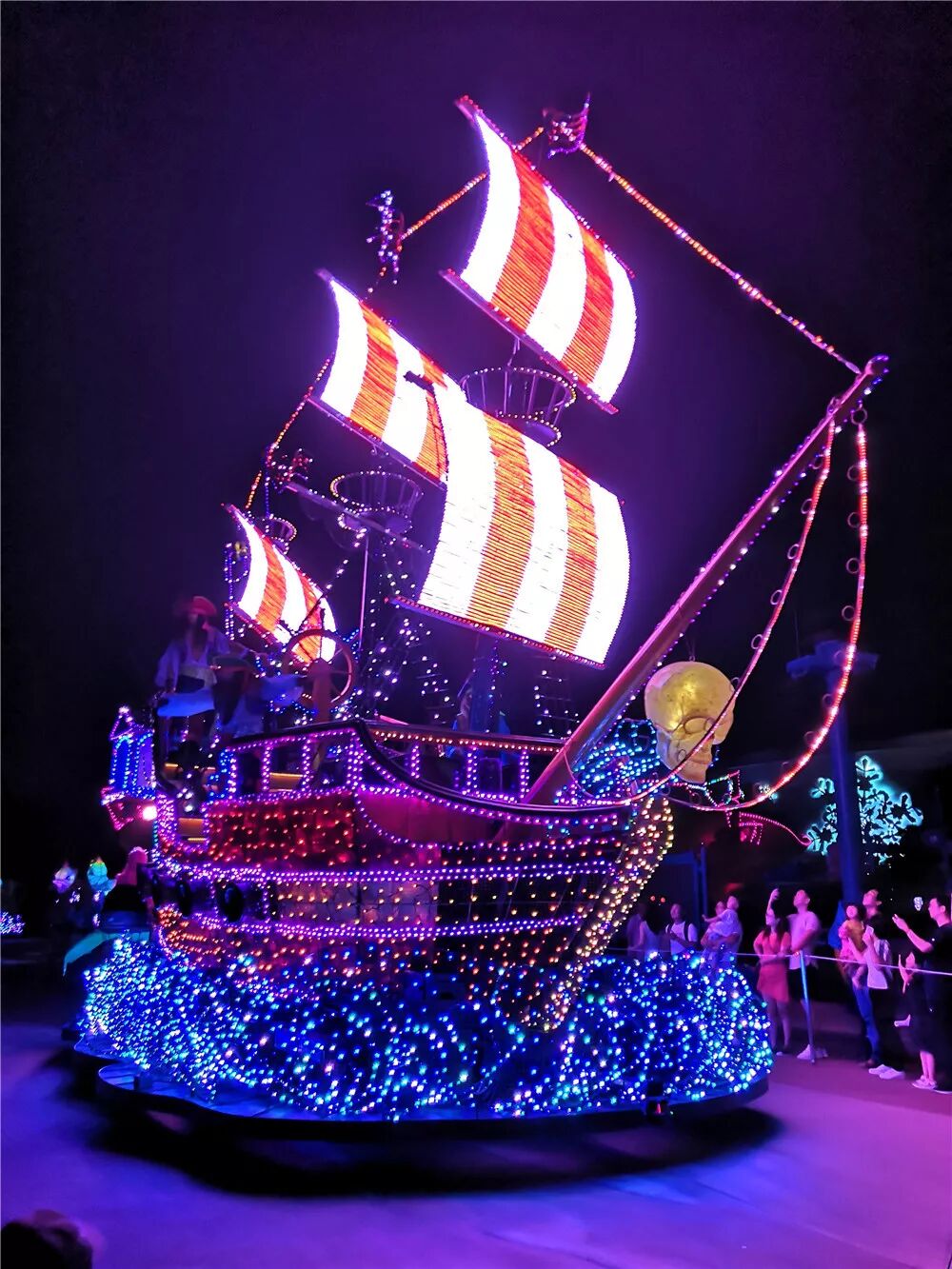 不同主题的花车会设计不同的装饰与灯光。如极地主题的花车会散发出凛凛蓝光,花车车身缀以雪地和冰柱。