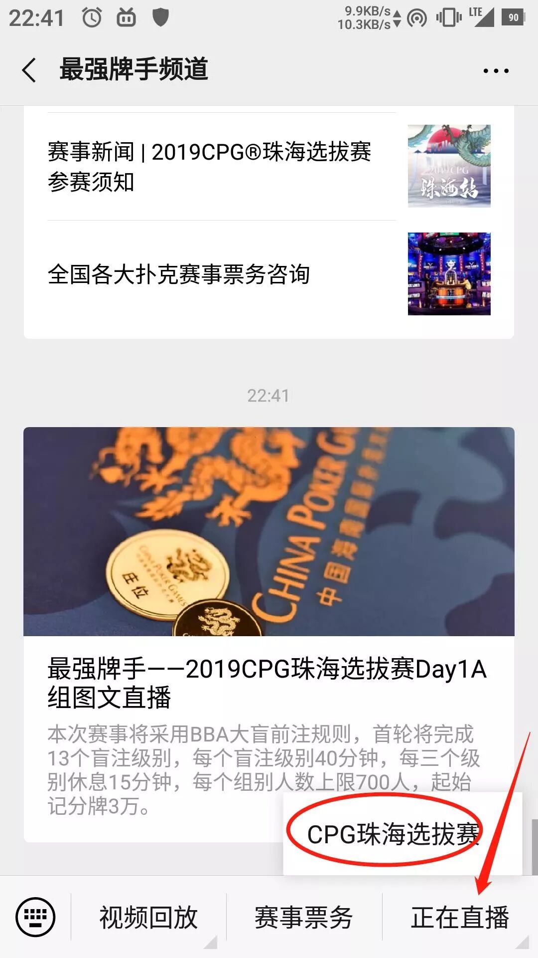如何观看本次CPG珠海选拔赛的图文直播?关注最强牌手频道(微信号:superpokerplayer)在底部菜单栏直播预告中点击CPG珠海选拔赛即可收到本次比赛图文直播的推送。
