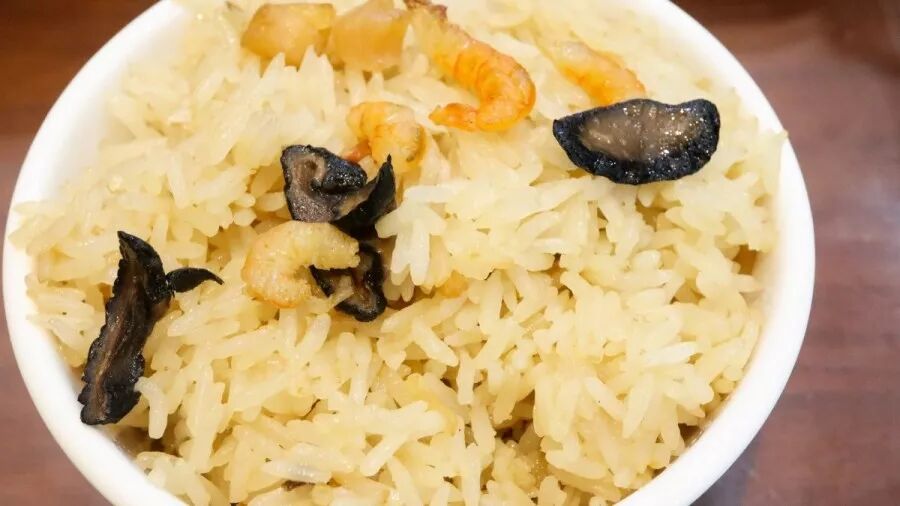 鼎盛牛排莊的 咸饭 加入了虾米、香菇、干贝,米粒呈现出一种晶莹透亮的光泽,尝起来偏硬却不失嚼劲。