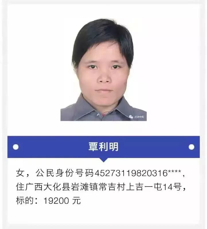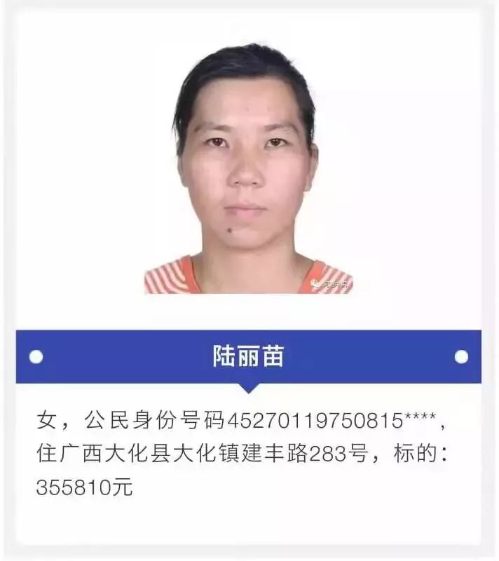 李 莉女,公民身份号码45012219850603****,住南宁市武鸣区香山大道城东大市场二区74号,标的:104000元