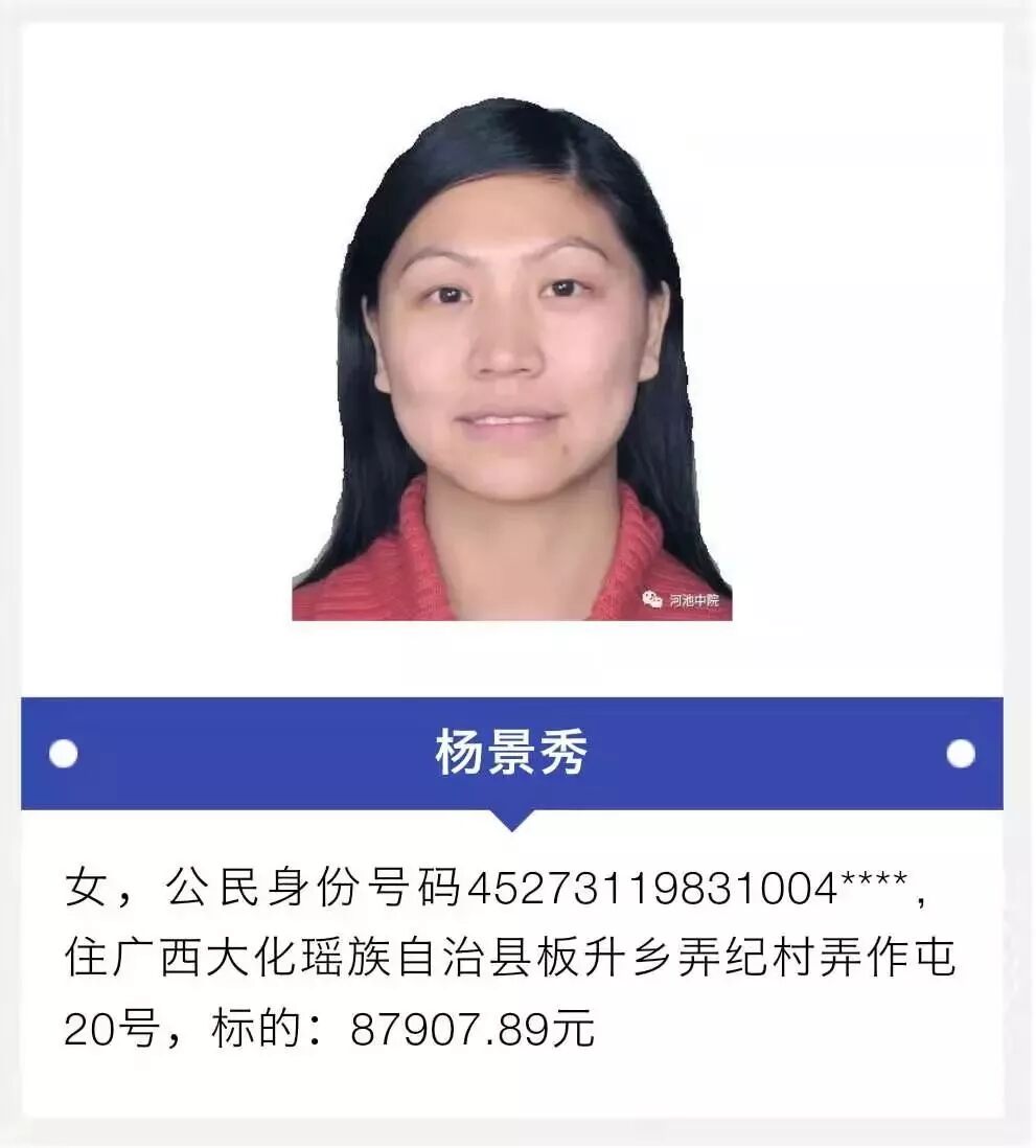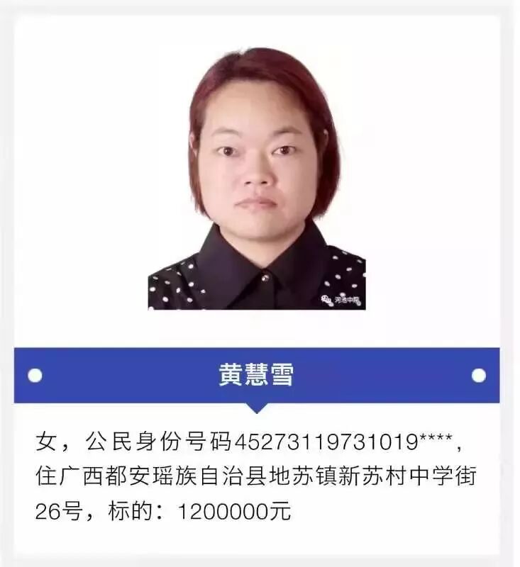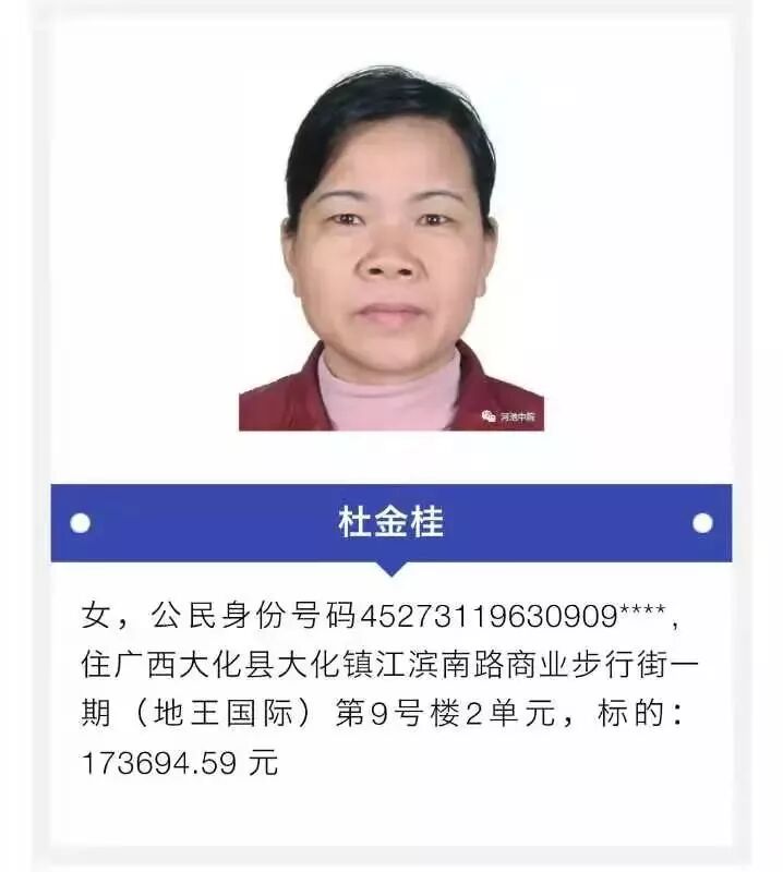 女,公民身份号码45273119650716****,住广西大化县大化镇文昌东路98号,标的:1800000元