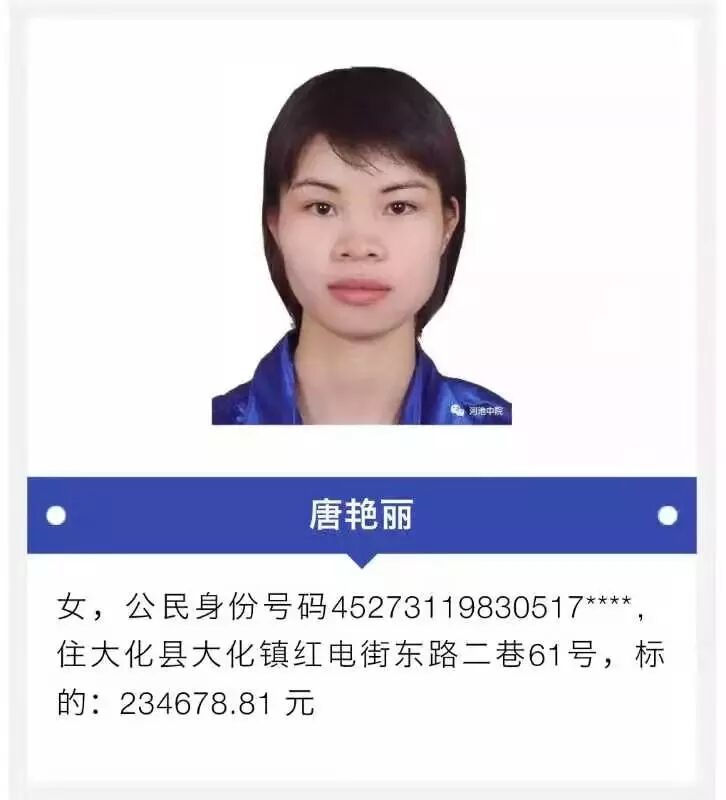 唐春萍女,公民身份号码45273119641015****,住大化县大化镇建丰路298号,标的:20000元