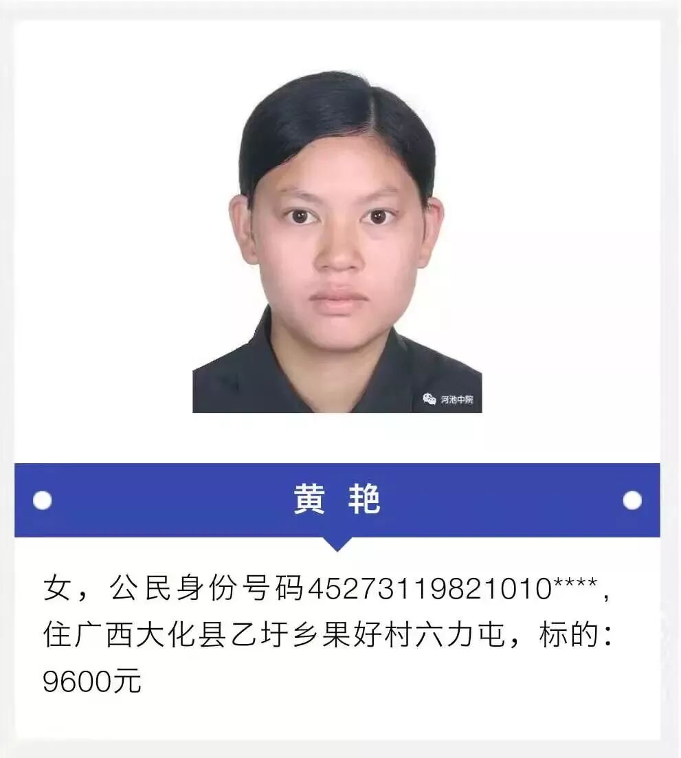 覃艳环女,公民身份号码45273019741211****,住广西大化县镇北西路将军山公园旁(晗轩布艺店80-8号),标的:95000 元