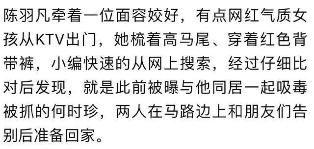 重点是,陈羽凡还和一位美女牵着手,这位美女看起来有些像网红,扎着非常高的马尾辫儿,穿着一件背带裤,头发和陈羽凡一样是红色的,剧知情人爆料,这位女子与陈羽凡早就同居了,当是陈羽凡因为涉毒被抓。