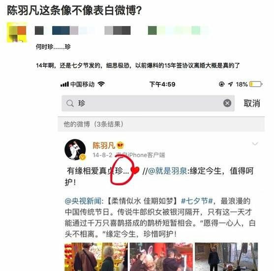 2014年陈羽凡七夕节就发出来一条微博:“有缘相爱真贞珍”,显然句末的“珍”字对应了何时珍的最后一个字。正是这样的细节也让不少网友大胆猜测在2014年陈羽凡这条微博或许就是在暗搓搓的表白何时珍。而当时陈羽凡和白百合虽然并没有离婚,但却传出俩人离婚协议的消息,如今看来似乎证实了当年的事情。