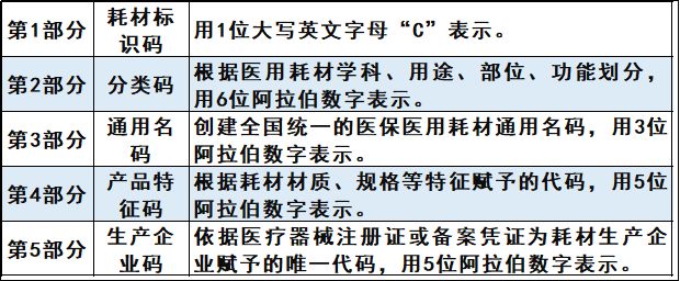 医保医用耗材编码分5个部分共20位,通过大写英文字母和阿拉伯数字按特定顺序排列表示。其中第1部分是耗材标识码,第2部分是分类码,第3部分是通用名码,第4部分是产品特征码,第5部分是生产企业码。