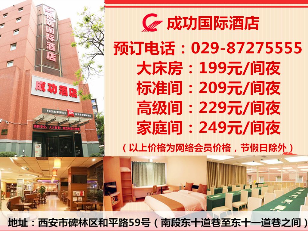 更多西安酒店内容,请百度搜索:西安车站附近酒店,西安大雁塔附近酒店,西安和平门附近酒店,西安情侣酒店,西安城墙附近酒店,西安西大街附近酒店,西安南大街附近酒店,西安含光门附近酒店,西安钟鼓楼附近酒店等关键词,成功酒店给您更多惊喜!