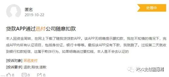 10月25日,有大量用户投诉环迅支付:使用一个’带你借’软件,恶意套取资料、没有经过用户验证授权直扣款208元”后经发现,带你借是一款贷款超市,本身没有小贷牌照。除去带你借,环迅支付牵扯的贷款软件共有跃吉网络、随我贷贷款APP、聚富分期、第一金融、造艺科技等等。
