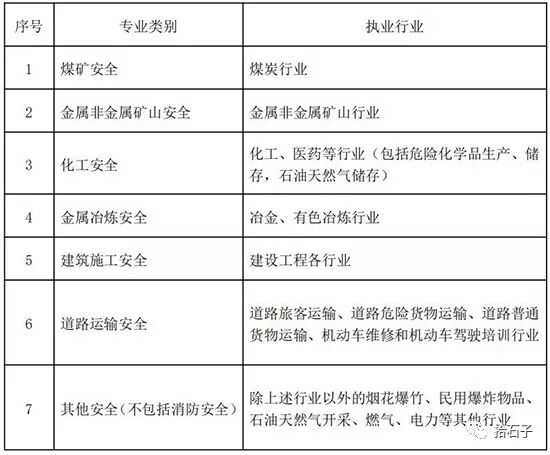 专业类别划分为:煤矿安全、金属非金属矿山安全、化工安全、金属冶炼安全、建筑施工安全、道路运输安全、其他安全(不包括消防安全)。