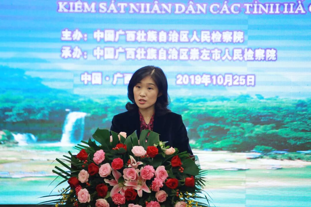自治区检察院党组书记、检察长崔智友,最高人民检察院第八检察厅王菁检察官,越南检察代表团团长、越南谅山省检察院检察长胡氏兰英,越南检察代表团副团长、越南最高人民检察院行政、经济、劳动案件检察厅副厅长阮借机,崇左市委副书记、统战部部长雷多荣发表座谈会致辞。中越两国边境地区市级和省级检察机关及与会专家代表围绕主题作了交流发言。