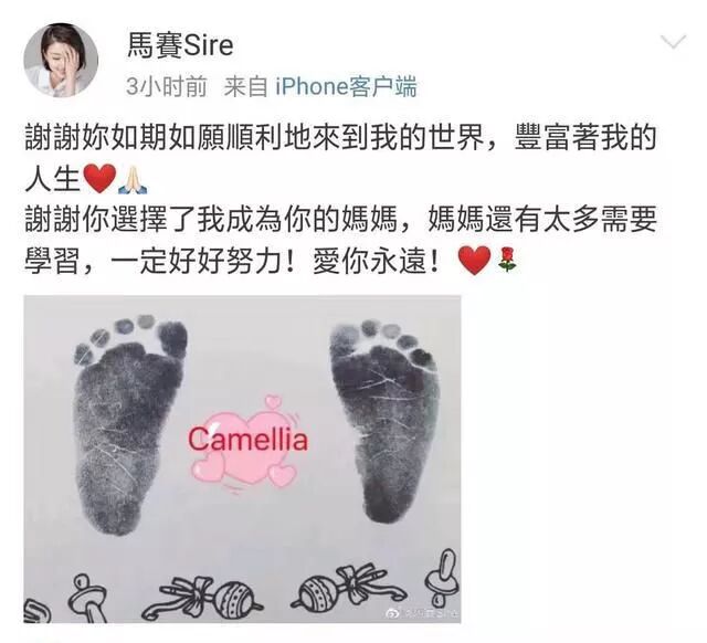 今日,马赛便在社交平台上晒出了一张有着宝宝脚印的照片,正式宣布已经诞下女儿Camellia,并且母女平安!对此马赛还为这张照片配文:谢谢你如期如故顺利地来到我的世界,丰富着我的人生,谢谢你选择了我成为了你的妈妈,妈妈还有太多需要学习,一定好好努力!爱你永远。