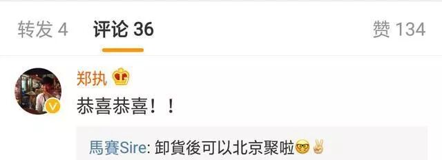 郑执在下面留言到:恭喜恭喜!作为刚升级当妈妈的马赛好像很迫不及待想要见到好友,见她在郑执的留言下回复:卸货后可以北京聚啦!