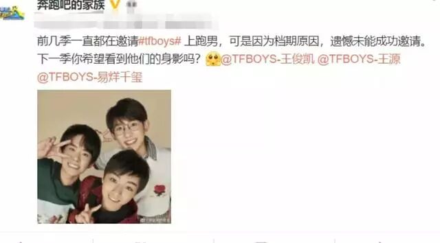 最近《跑男吧》官博非常活跃,前几天官方点名TFBOYS,询问观众是否期待TFBOYS的身影。