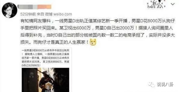 近日又有网友在网上曝出,卓伟或将爆料某个一线男星D先生花8000万从卓伟手中买回出轨照!据这位网友所说,这组照片早就被偷拍出来了,可在去年的时候被D先生本人买了回去。而这位D先生位居一线,出轨的时候正是某综艺新一季开播,花8000万从卓伟手里把照片买回来的钱,其中某卫视出6000万,男星自己出2000万!