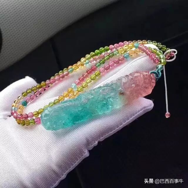 顶尖玻璃体亮色仙女系粉蓝碧玺龙柱!醇美鲜亮!粉帕蓝,与樱花粉!完美配色渐变!润泽水亮!搭4mm极品玻璃体冰淇淋色彩虹碧玺链