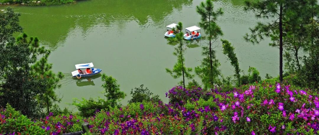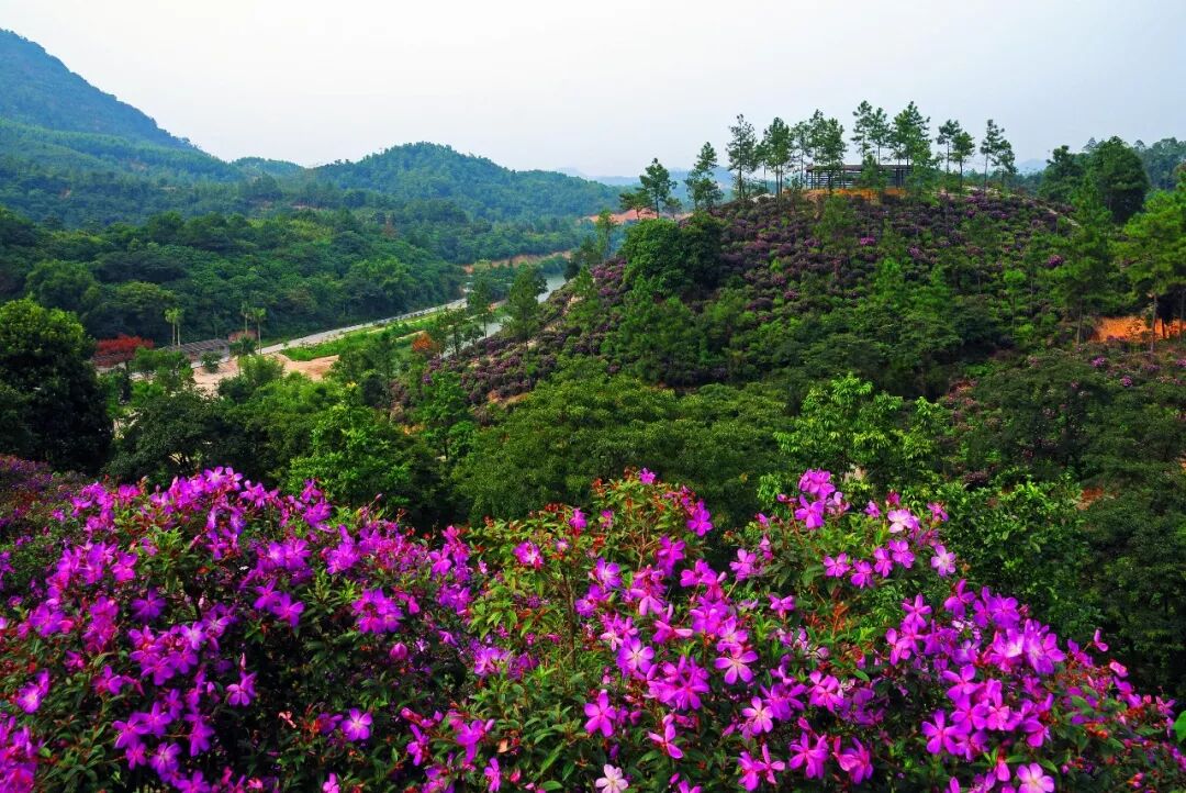 雁鹰湖度假村位于广州花都梯面镇中学对面,首期富贵牡丹园庄园占地面积200亩,引进巴西野牡丹,巴西野牡丹全年可开花,8月始进入盛花期,彼时整片山林都被妖娆的紫色覆盖,异常美丽。