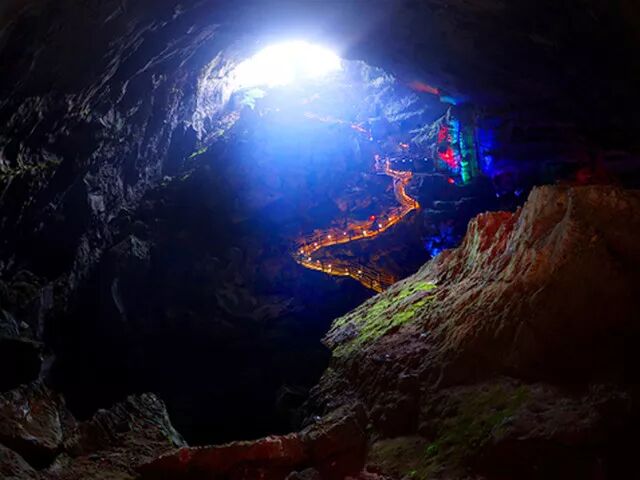 天然的洞口宽敝雄伟,置身其中,一种“别有洞天”的感觉油然而生。乘舟前去,只见河道蜿蜒曲折,时而开阔,景象壮观;时而狭窄,最窄处仅1.6米,钟乳垂悬、伸手可及。十分刺激。
