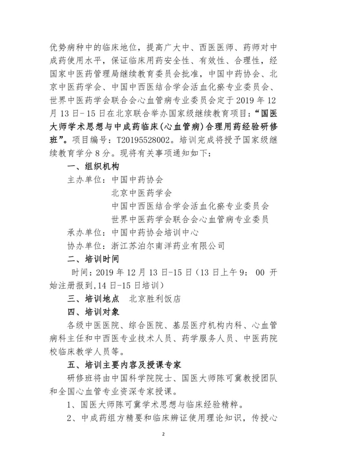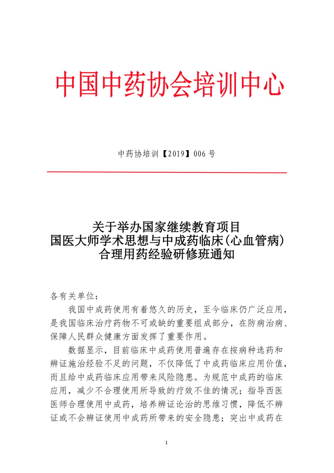 数据显示,目前临床中成药使用普遍存在按病种选药和辨证施治经验不足的问题,不仅降低了中成药临床应用价值,而且给中成药临床应用带来风险隐患。为规范中成药的临床应用,减少不合理使用所导致的疗效不佳的情况;指导西医医师合理使用中成药,培养辨证论治的思维习惯,降低不辨证或不会辨证使用中成药所带来的安全隐患;突出中成药在优势病种中的临床地位,提高广大中、西医医师、药师对中成药使用水平,保证临床用药安全性、有效性、合理性,经国家中医药管理局继续教育委员会批准,中国中药协会、北京中医药学会、中国中西医结合学会活血化瘀专业委员会、世界中医药学会联合会心血管病专业委员会定于2019年12月13日- 15日在北京联合举办国家级继续教育项目:“国医大师学术思想与中成药临床(心血管病)合理用药经验研修班”。项目编号:T20195528002。培训完成将授予国家级继续教育学分8分。