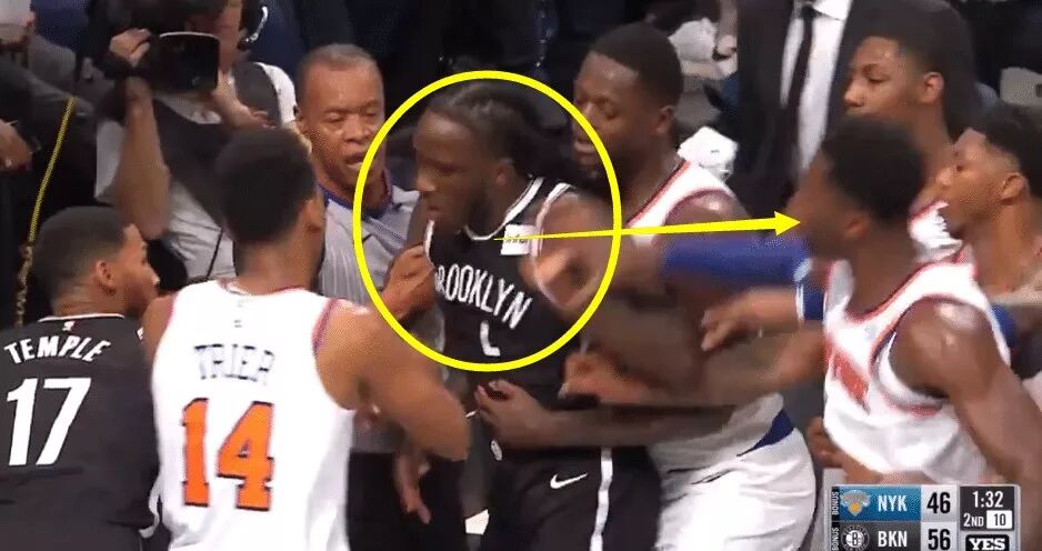 尽管杜兰特赛季报销,但是欧文率领的篮网队实力仍高出尼克斯不少,首节比赛篮网队凭借主场优势32-23领先对手9分,第2节比赛双方打的很焦灼,不过篮网这边除了欧文之外,勒韦尔、普林斯和哈里斯都有不错的发挥,他们也是一直保持着10分以上的领先优势,不过在这节还剩下1分32秒的时候,两队球员发生了一次大规模的冲突!