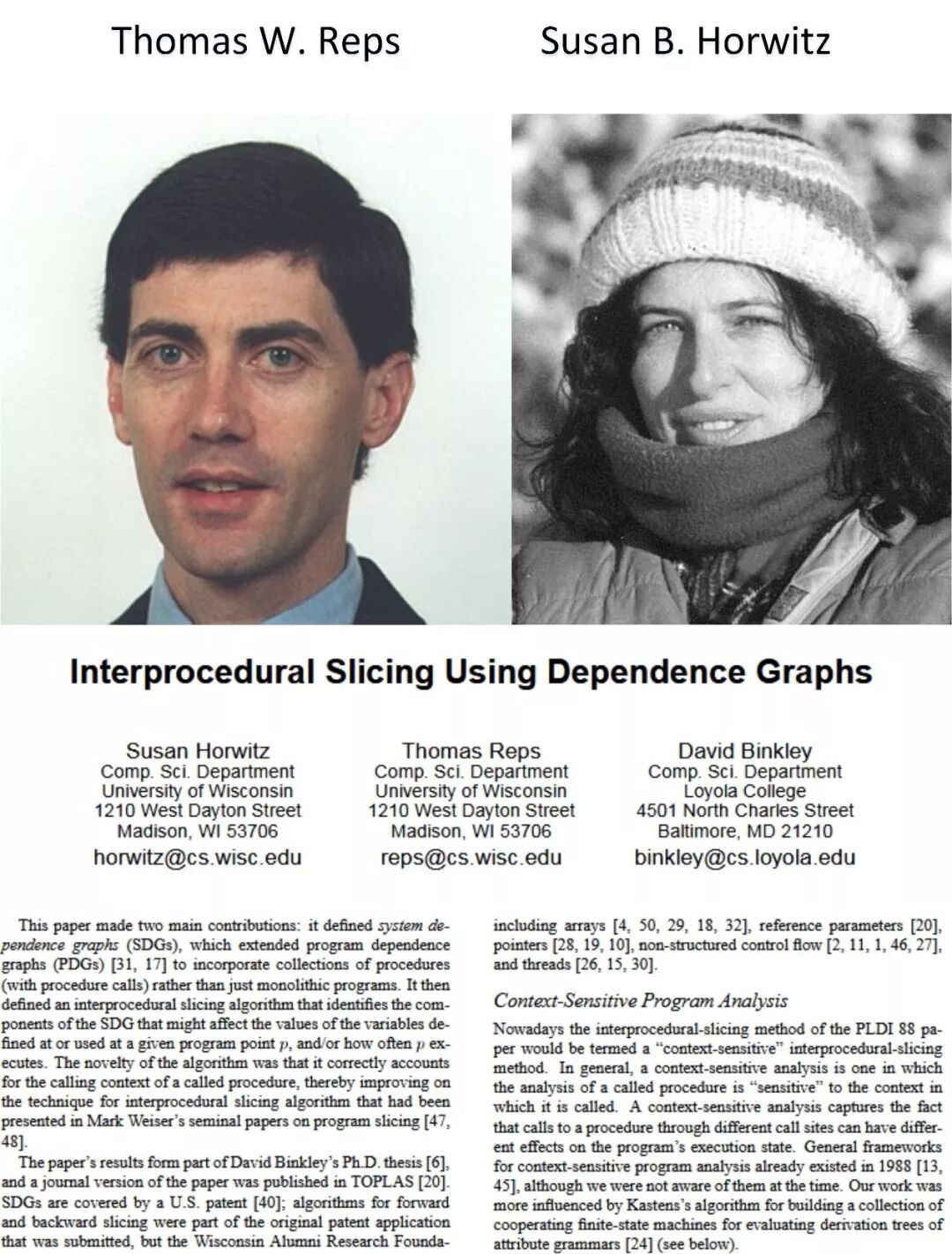 这两人合写了Efficient comparisonof program slices、The use of program dependence graphsin software engineering等领域内开创性的论文(几乎每篇PL的论文,里面必有一页弯弯曲曲让人看花眼的逻辑公式。程序语言(PL)的论文,不是用程序来描述,而是用一些老古董的逻辑符号)。