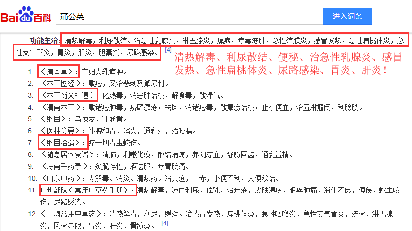 《本草经疏》中记载:“蒲公英昧甘平,其性无毒。当是入肝入胃,解热凉血之要药。乳痈属肝经,妇人经行后,肝经主事,故主妇人乳痈肿乳毒,并宜生暖之良。