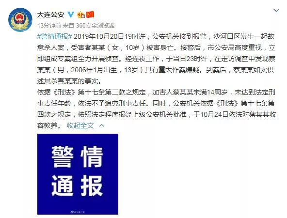 10月24日21点17分,@大连公安发布警情通报:2019年10月20日19时许,公安机关接到报警,沙河口区发生一起故意杀人案,受害者某某(女,10岁)被害身亡。
