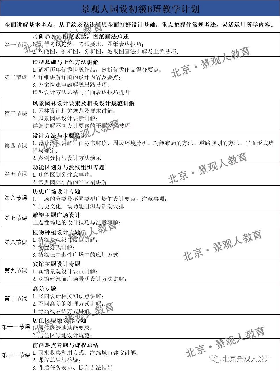 景观人工作室成立以来,不断对课程进行精进,保持全国领先。我们拥有一整套完善的课程体系,每个班次的课程内容都是由教学组精心讨论而出,内容系统且全面,拒绝套路式教学。从景观人学员的初试成绩和复试表现来看,我们一整套教学体系取得了非常显著的效果。