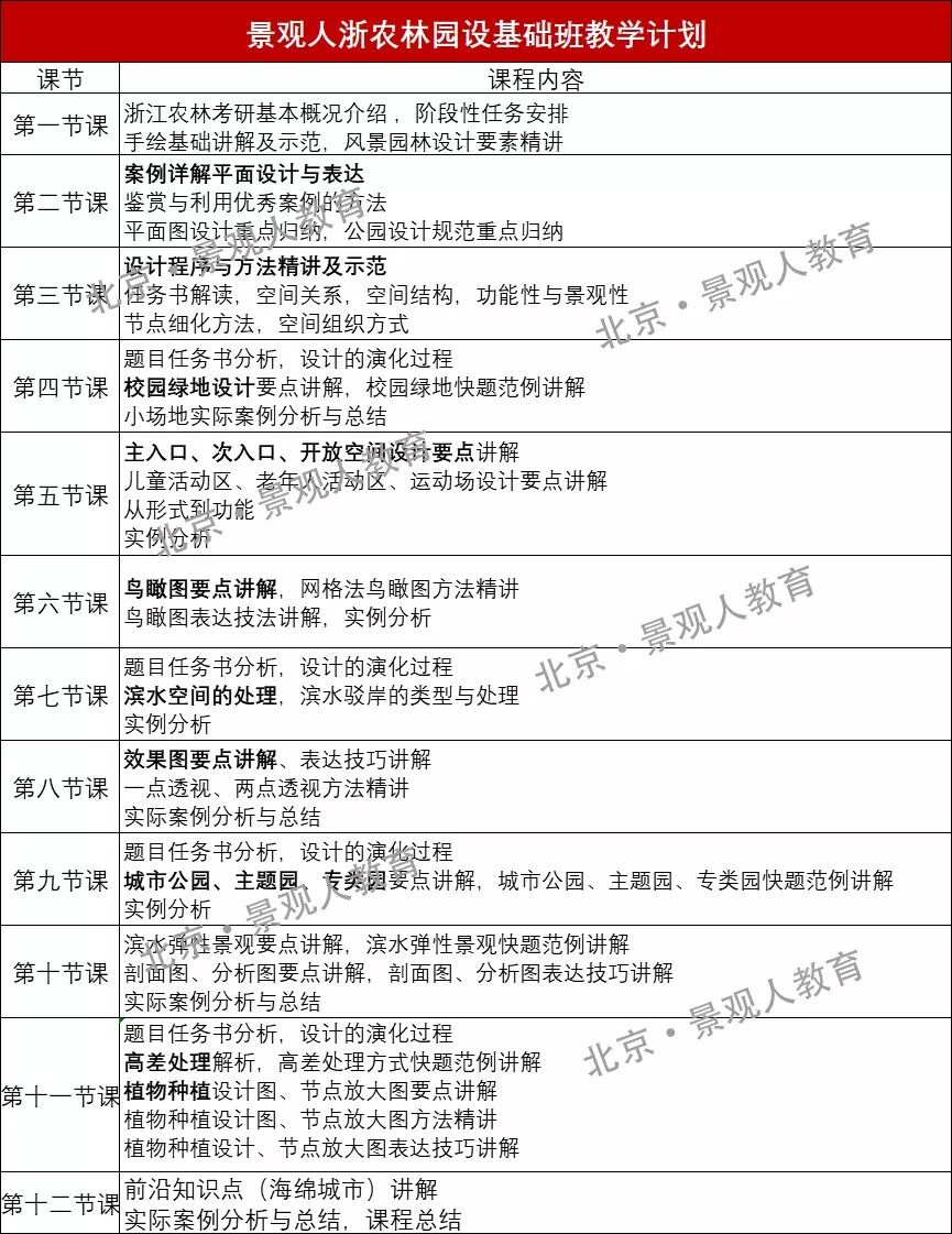 景观人工作室成立以来,不断对课程进行精进,保持全国领先。我们拥有一整套完善的课程体系,每个班次的课程内容都是由教学组精心讨论而出,内容系统且全面,拒绝套路式教学。从景观人学员的初试成绩和复试表现来看,我们一整套教学体系取得了非常显著的效果。